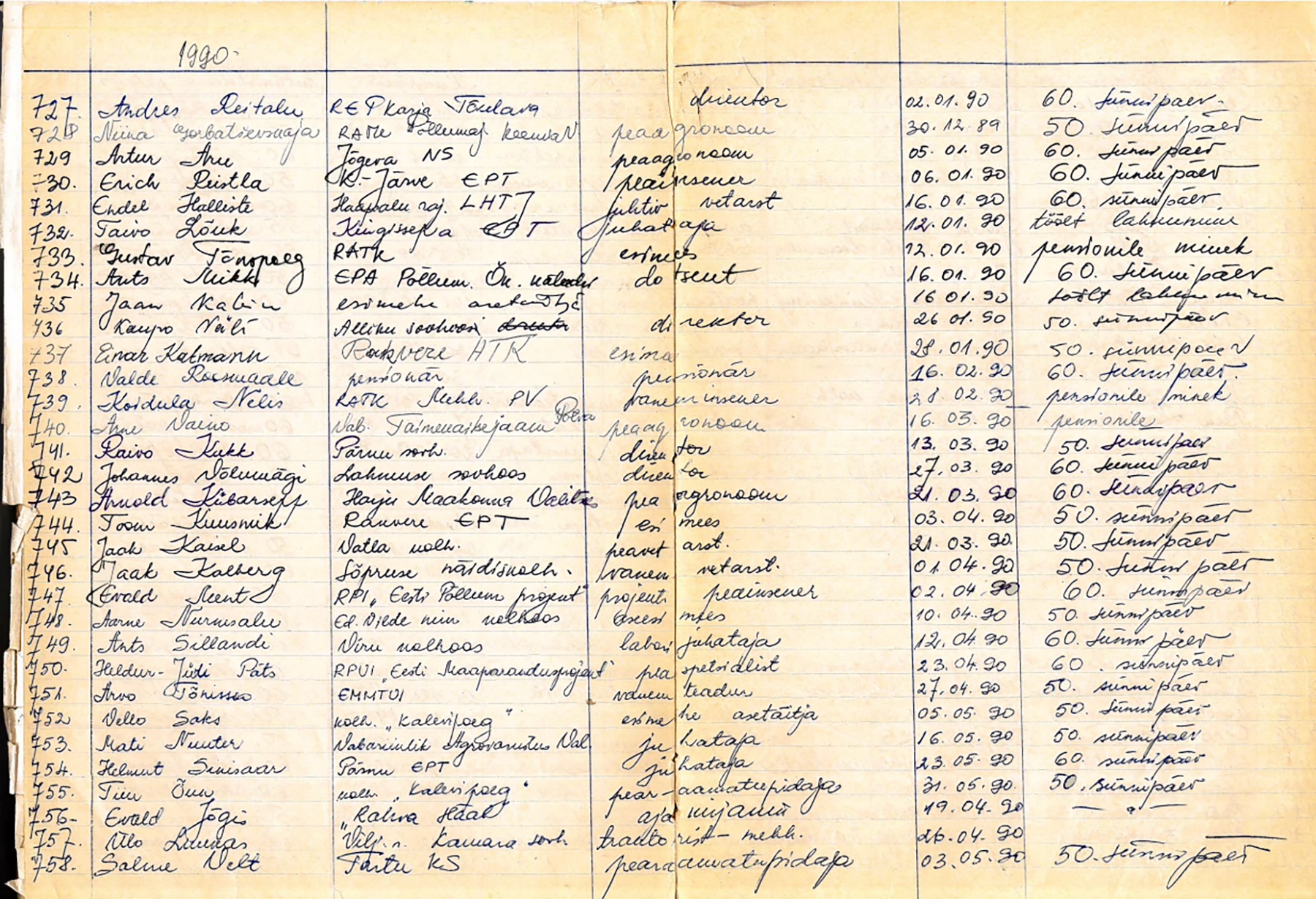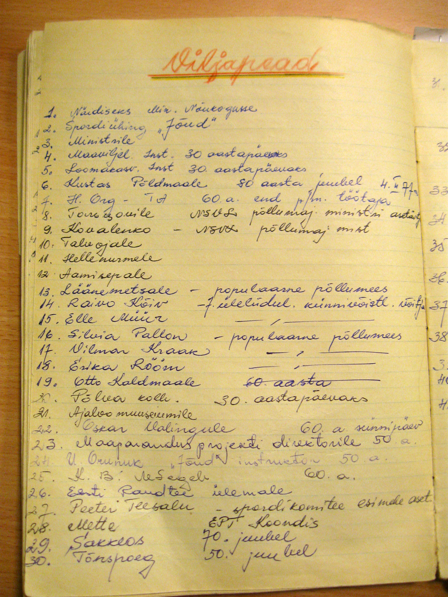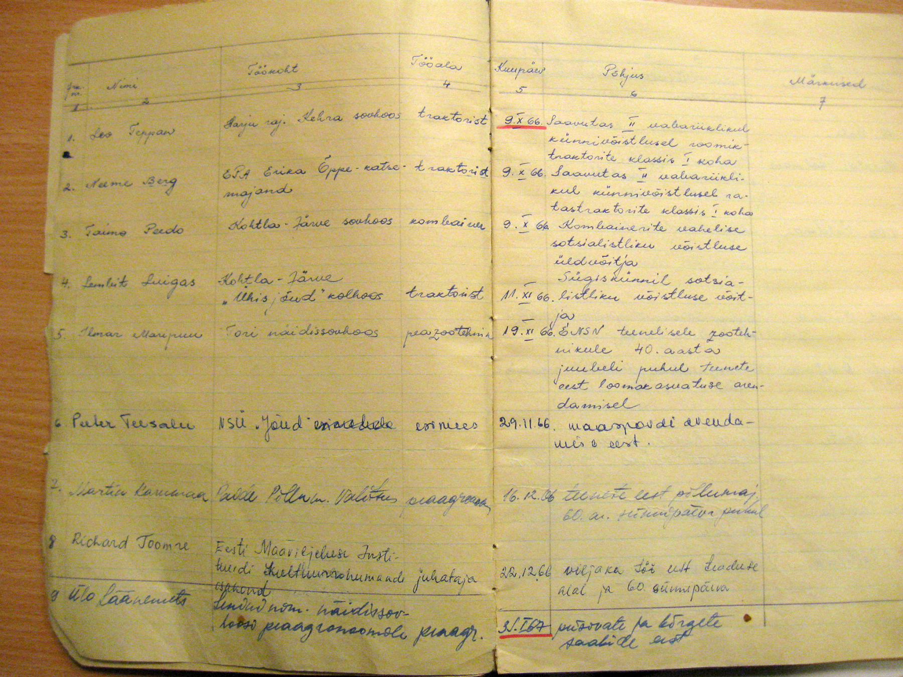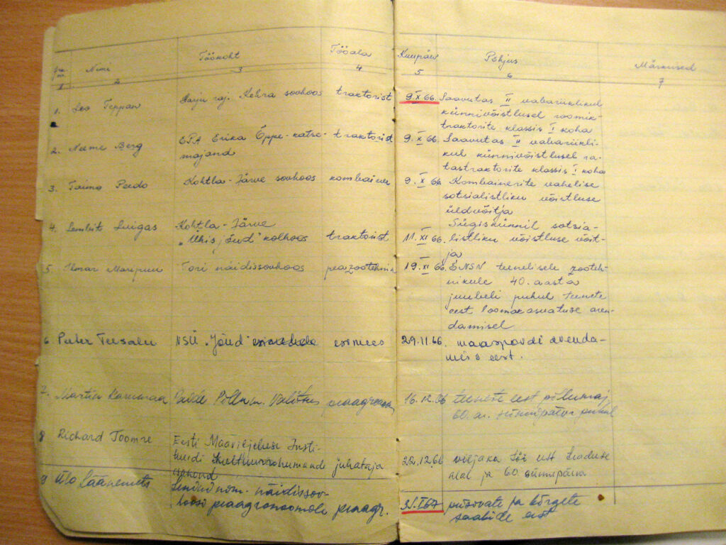Pildistus autasude registreerimise raamatust. 1990. aastal omistati medaleid teenekatele põllumeestele juubelite puhul. Foto erakogust