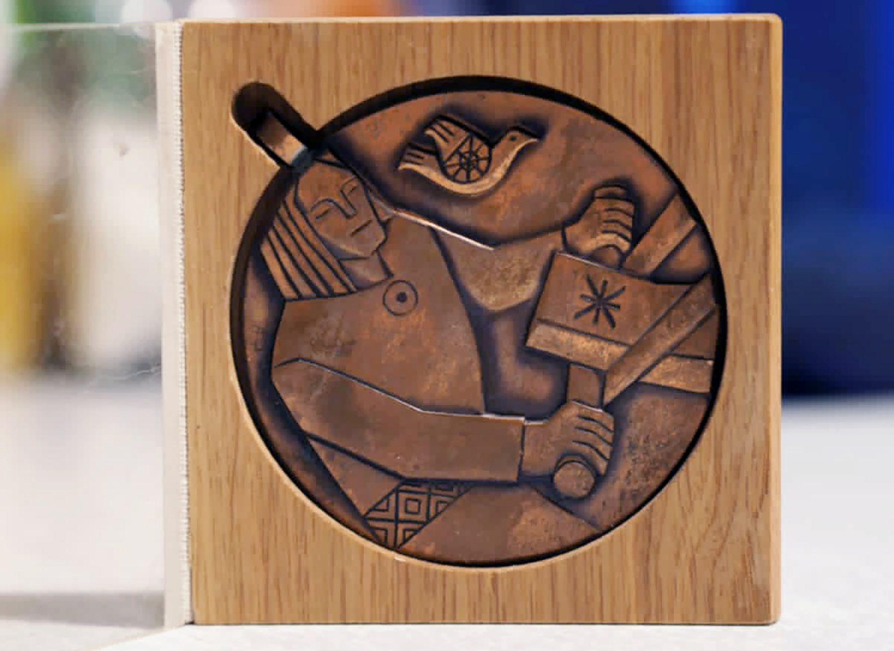 Heinz Valgu kavandi järgi valmistatud medali esiküljel oli reljeef: Kalevipoeg atra hoidmas, paremal lind lendamas. Medali materjal oli metallisulam (punane vask, stantsitud), läbimõõt 6 cm, paksus 3 mm, ülaääres kinnitusaas. Karp puidust, orgaanilisest klaasist kaanega.