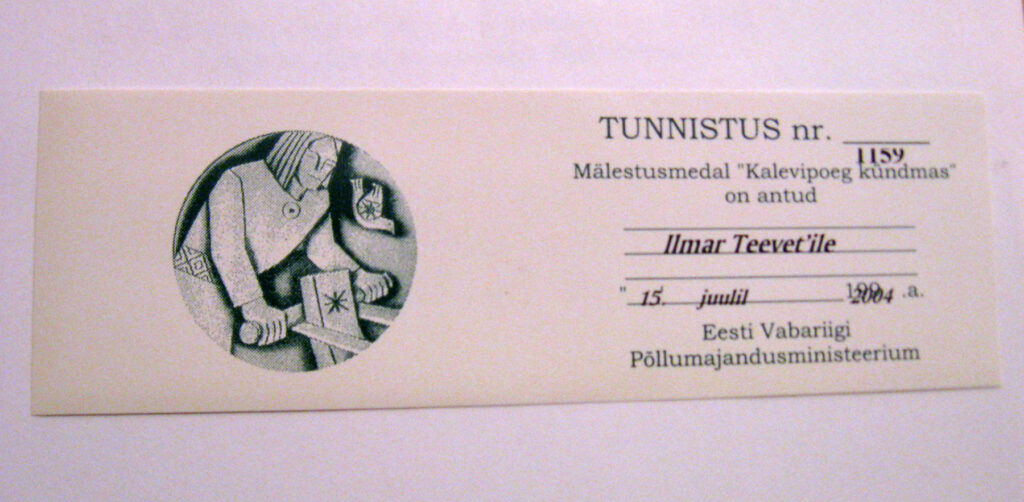 Medaliga kaasnev tunnistus. Foto: Heino Laiapea