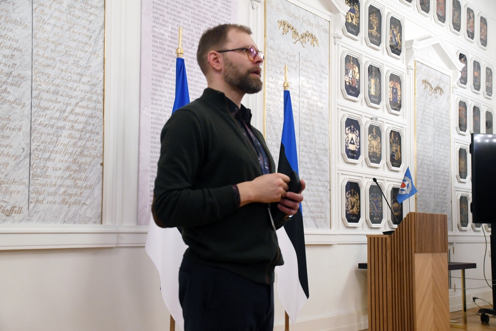 Marten „Tšellariton” Meibaum muinsuskaitsekuu avapäeval Rüütelkonna maja Maapäeva saalis.