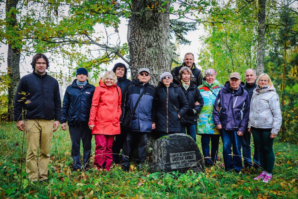 Ajaloohuvilised Kambja kihelkonnas Rootsi kroonprintsi istutatud tamme ja mälestuskivi ees.