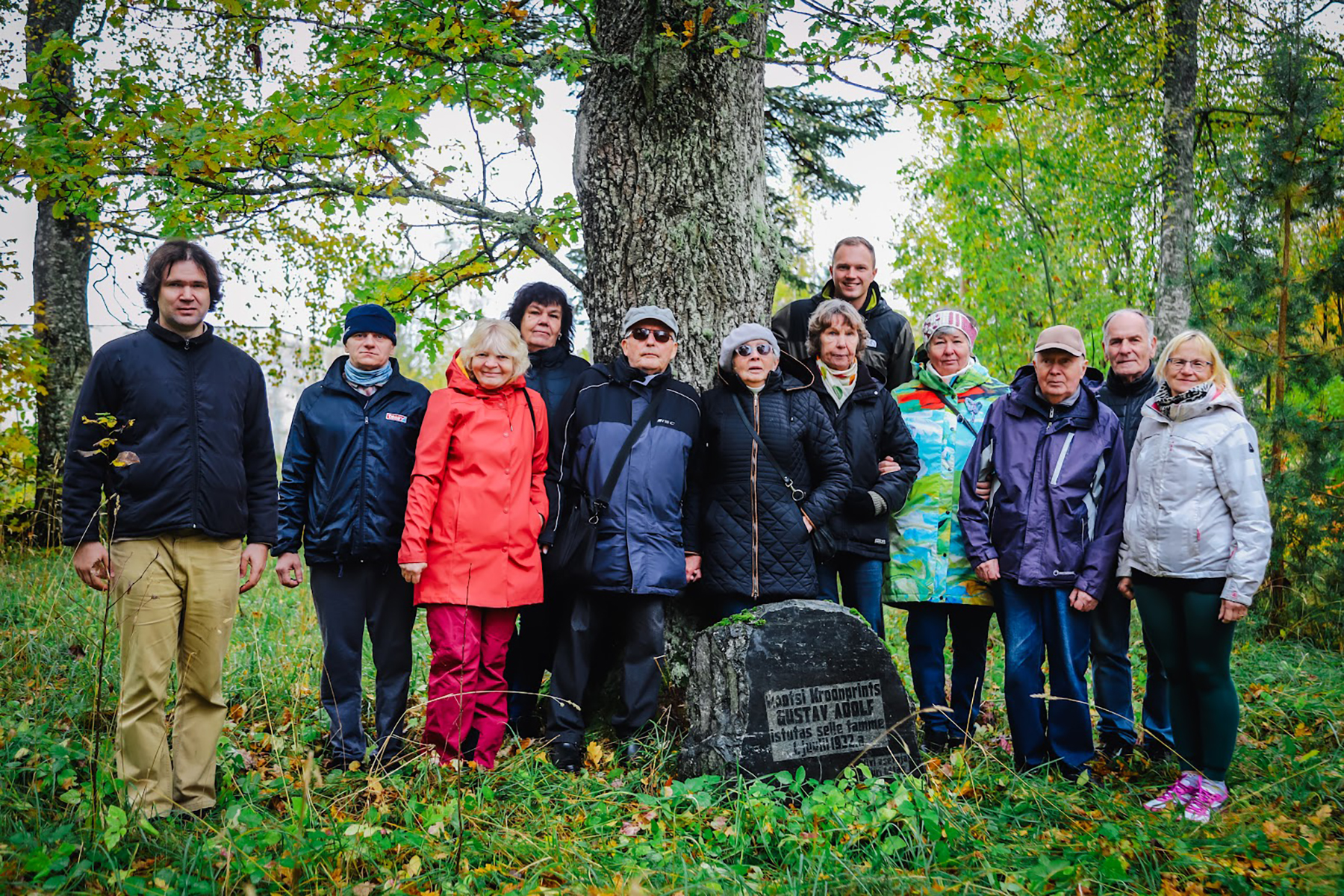 Ajaloohuvilised Kambja kihelkonnas Rootsi kroonprintsi istutatud tamme ja mälestuskivi ees.